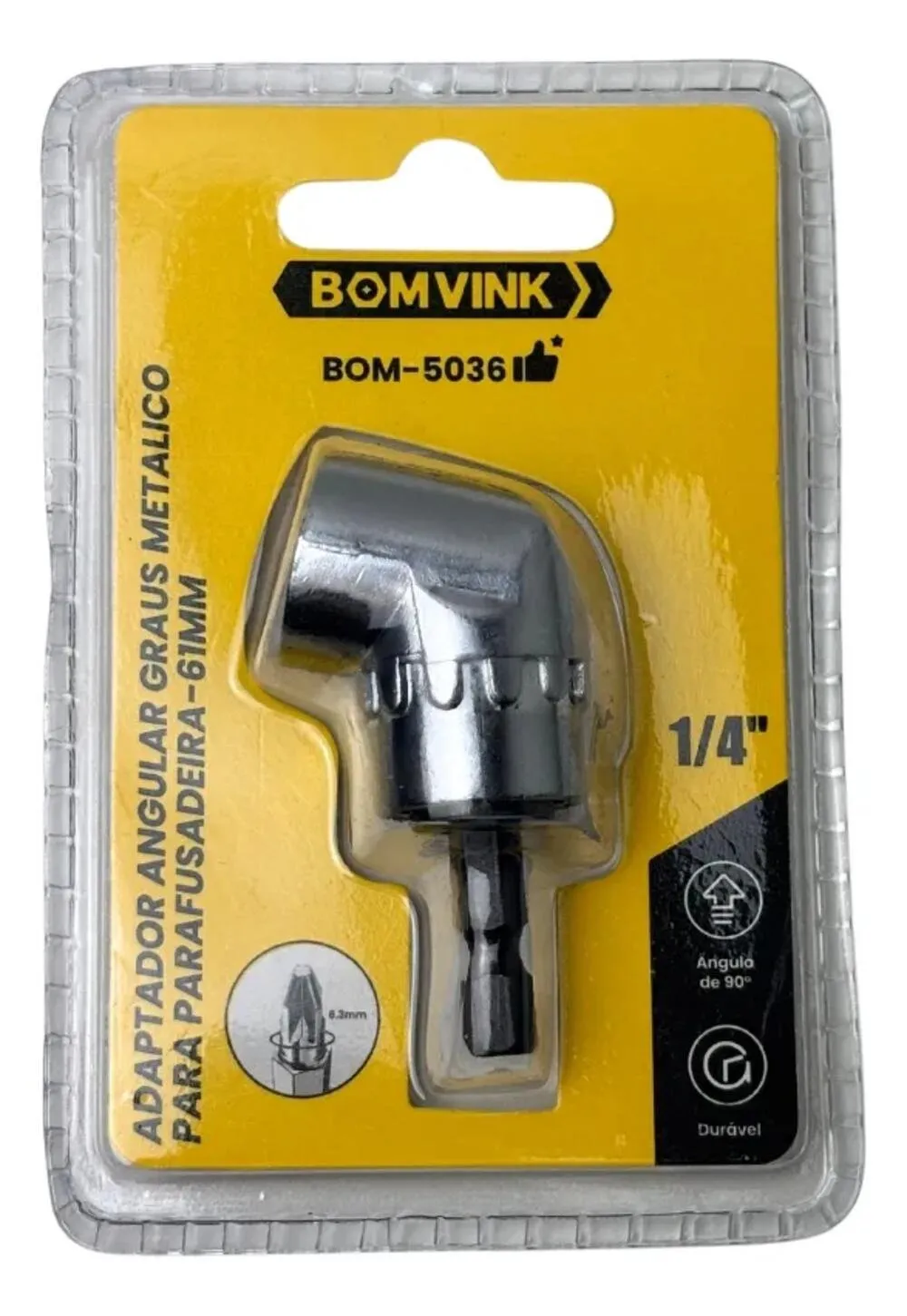 O Adaptador Angular Metálico Bomvink BOM-5036 foi desenvolvido para oferecer praticidade, precisão e resistência em trabalhos de parafusamento e perfuração em áreas estreitas ou de difícil acesso. Com ângulo de 90 graus e 61mm de comprimento, permite trabalhar com mais conforto e eficiência onde ferramentas convencionais não alcançam.