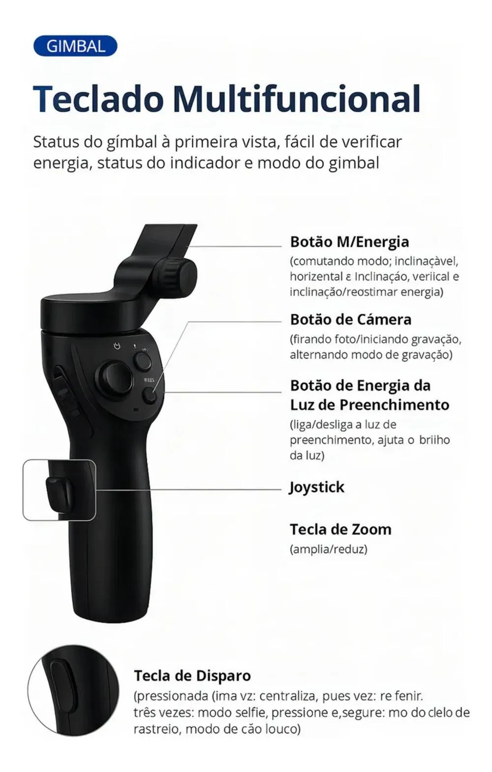Com controles intuitivos no próprio equipamento, permite alternar modos de gravação, ajustar ângulos e acompanhar movimentos com precisão. Compatível com a maioria dos smartphones do mercado, é ideal para vídeos em redes sociais, YouTube, TikTok, Instagram, transmissões ao vivo e produções audiovisuais.
